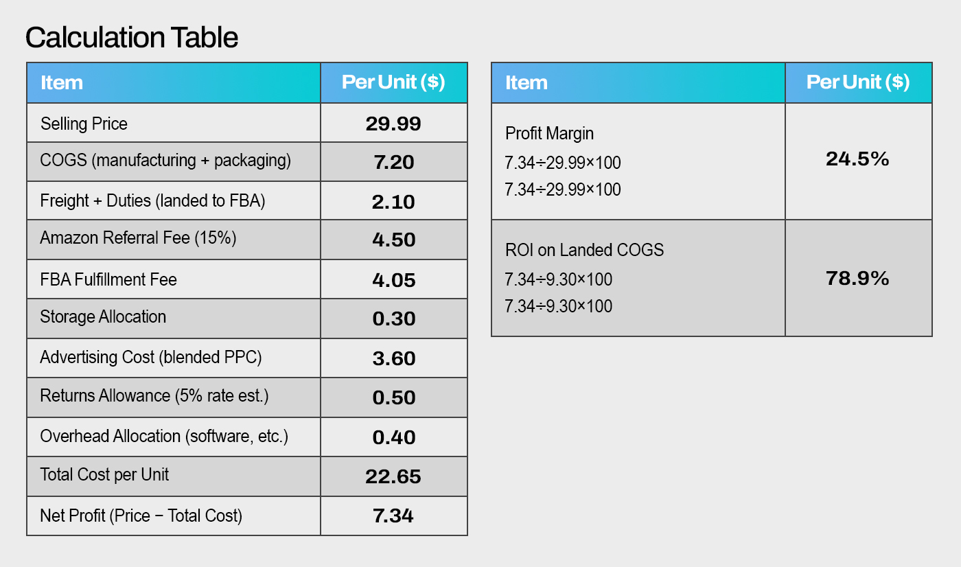 Turn net profit into a percentage so you can compare across SKUs and pricing tests. Also track ROI on landed COGS to see how efficiently your cash is working—handy when choosing which SKUs to prioritize for restock.